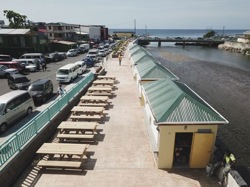 Positioned on the south side of the Roseau River, what used to be a single public toilet, sewer and disorganised bus stop has been transformed into a modern, clean, boardwalk with food and supply vendors in kiosks with benches, tables, tent coverings, landscaping, new clean bathrooms. Most importantly, this new space is where Dominicans can go to meet, greet, drink and eat all under cover, with live music, sea breeze and the camaraderie of friends and family in time well spent.